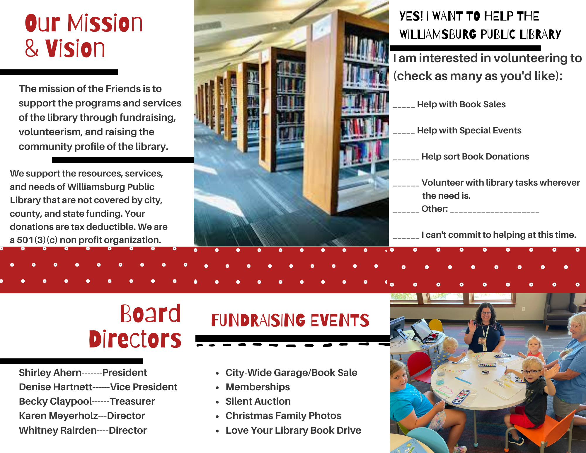 Williamsburg Library Friends is a nonprofit advocacy organization which supports the Library. Our volunteer members advocate, educate, and raise funds on behalf of the Library, its patrons, and the community.