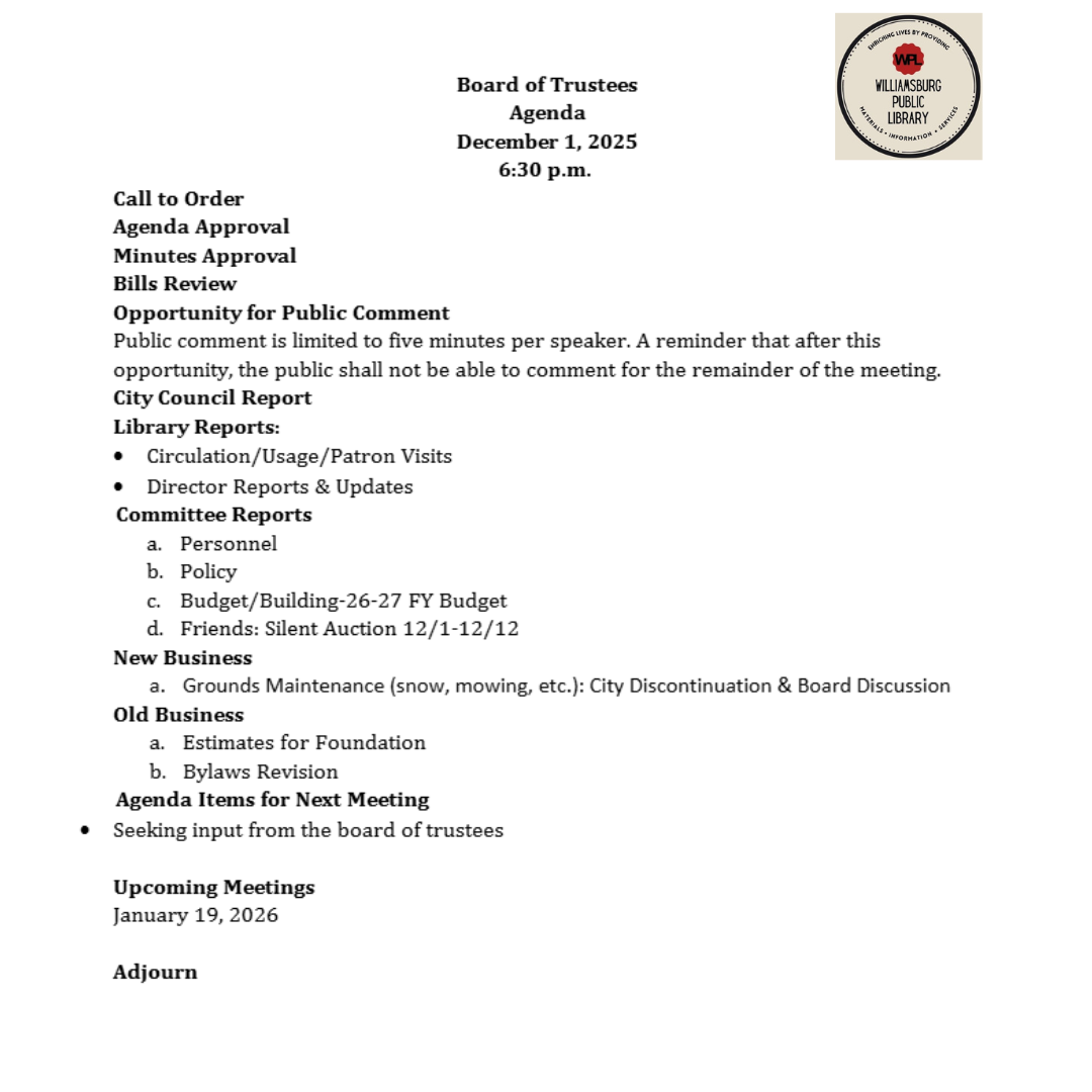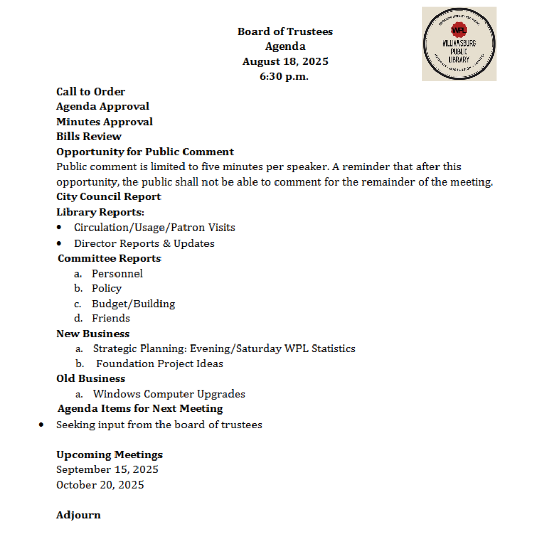 Looking for previous agendas or minutes? Please contact WPL to access those not listed.